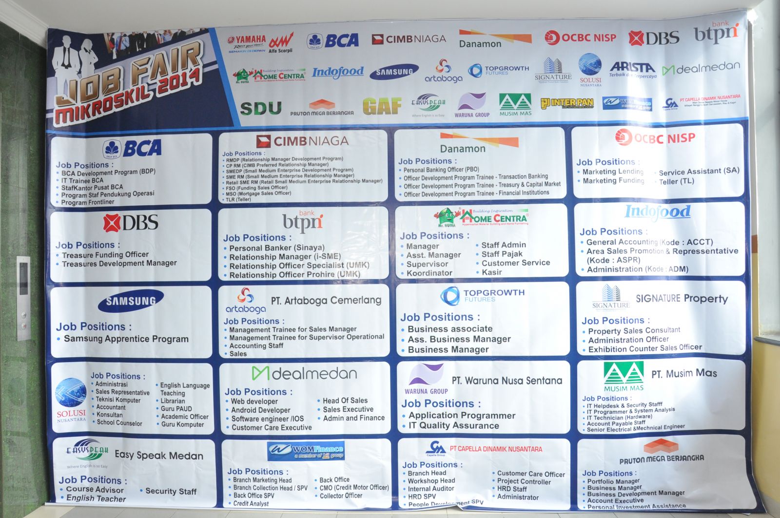 Kegiatan utama dalam jobfair ini adalah merupakan pameran informasi seputar lowongan pekerjaan dari berbagai perusahaan yang membutuhkan sumber daya manusia untuk menempati posisi-posisi strategis di perusahaan. Kegiatan Mikroskil Job Fair 2014 diikuti oleh 28 perusahaan terdiri dari PT. Musim Mas, PT. Bank Danamon Indonesia, Tbk, PT. Capella Dinamik Nusantara, PT. Arta Boga Cemerlang, PT. Bank DBS Indonesia, PT. Sumatera Dinamika Utama, Solusi Nusantara, Bank OCBC NISP, PT. Samsung Indonesia, PT. Indofood CBP Sukses Makmur, Tbk., PT. Waruna Nusa Senata, PT. Alfascorpii, Wom Finance, Bank BTPN, PT. Waruna Nusa Senata, Arista Group, PT. Sinar Sosro, PT. Bank Central Asia, Tbk, Bank CIMB NIAGA, etc.